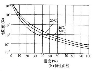 湿度传感器的结构如图(a)所示,该传感器的电阻值和湿度关系曲线如图(b)所示。当曲线上可知湿度加大时,传感器电阻值就会减小。