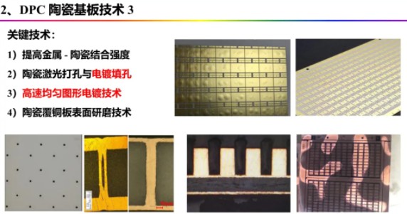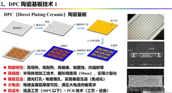 dpc就是直接电镀陶瓷基板,可以看出来其制备工艺就是陶瓷片通过激光打孔,然后通过磁控溅射镀膜是陶瓷表面金属化,然后在采用半导体光刻显影刻蚀,其包括图形电镀技术来制备线路层。