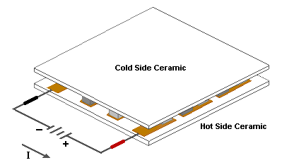 虽然P型和N型材料都是铋和碲的合金,但它们在相同温度下具有不同的自由电子密度。P型骰子由电子不足的材料组成,而N型则由电子过剩的材料组成。当电流(安培数)在模块中上下流动时,它试图在材料中建立新的平衡。电流将P型材料视为需要冷却的热结,将N型材料视为需要加热的冷结,由于材料实际上处于相同的温度,结果是热端变的更热,而冷端变得更冷。电流的方向将决定一个特定的芯片是冷却还是加热。简而言之,颠倒极性将切换冷热面。