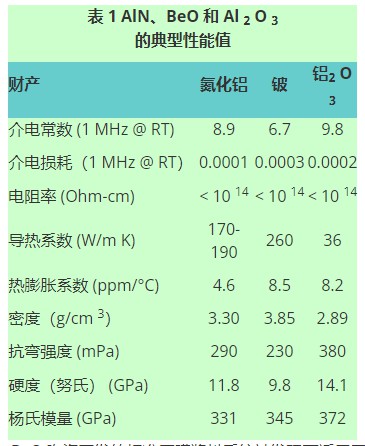 经过广泛研究和开发,随着热导率的提高,氮化铝已成为氧化铍替代基板材料。虽然它不能作为氧化铍的100%直接替代品,但它无毒、操作安全,并且其导热率远高于氧化铝并接近氧化铍。图1看出氮化铝、氧化铍和氧化铝的电气和物理特性,氮化铝的介电常数为8.9,高于氧化铍,这是电路设计人员关注的问题,因为它会导致高并联电容。因此,为氧化铍制定的设计规则不能用于氮化铝陶瓷基板。可以在带有氮化铝器件的设计中引入调谐电路,以克服额外电容的影响。氮化铝可用的热分析数据使设计人员能够将这种衬底材料用于高功率微波应用,也是1996年氮化铝陶瓷基板的电阻器和终端的器件上首次被实现。