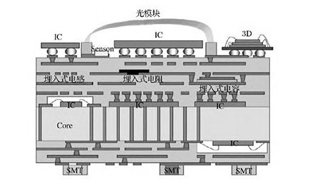 因为系统封装{SIP}技术是指将不同类型的元件通过不同的技术混载于同一封装之内,而某种典型的SIP高密度电子集成模块的横切面,这是早一块核心陶瓷基板上根据需要逐层造出各元件连线层,各有源无源件埋入层,光学系统层等;再在造好的陶瓷基板上用倒装形式或线焊方式安装上各个IC和MEMS,也包括不能埋入的无源件和传感器。