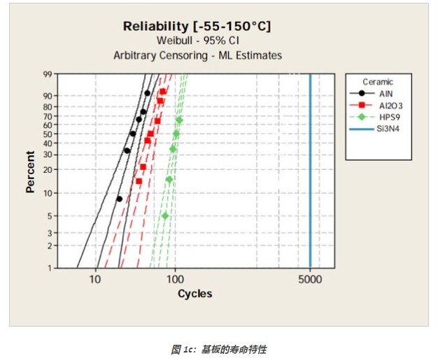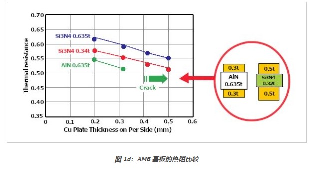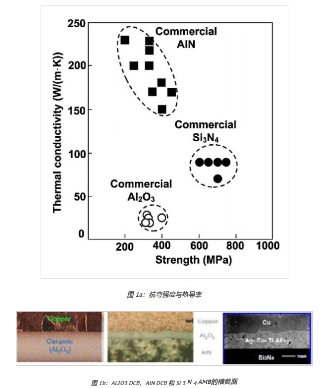 陶瓷基板是功率模块热阻的关键决定因素,氮化铝和氮化硅陶瓷基板的导热性能优于氧化铝陶瓷基板【图1a】。氮化铝陶瓷基板DCB的使用寿命不如氧化铝DCB【图1c】,添加到氮化铝表面的薄氧化铝层使其适用于DCB技术的氧化铝陶瓷基板【图1b】。氮化硅不是DCB技术的选项,但氮化铝和氮化硅陶瓷基板与AMB活性金属钎焊技术一起使用。铜和陶瓷之间的钎焊层可以更好低吸收应力,因此AMB陶瓷基板的寿命比DCB陶瓷基板长得多。