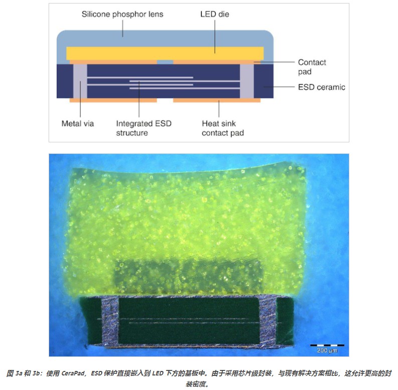 如今为了解决这个问题,TDK对CeraPad采取了全新的方法,将公司在小型化多层ESD保护元件和LTCC陶瓷基板开发方面的长期经验非常优雅地结合在一起。CeraPad是一种集成了ESD保护的超薄陶瓷基板。这对于满足最大小型化和最佳ESD保护需求,从而在敏感应用中实现了最高程度的ESD集成。因此,在它完全消除了对额外分立ESD组件的需求,使LED的安装密度大大增加,由于更有效地使用陶瓷基板表面。