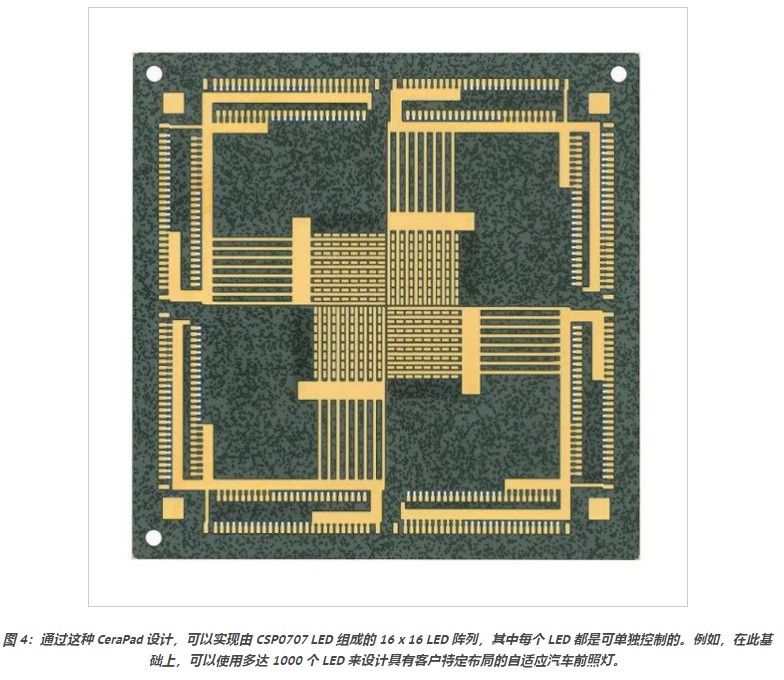 在使用LED矩阵阵列的自适应前照灯,而CeraPad不仅适合用作集成ESD保护的LED芯片陶瓷基板,而且与传统印刷电路板一样,也可以同时用作重新分布层。以这种方式可以实现多达十个这样的再分布层,并且这里的热导率随着每增加一层而降低。然而,在CeraPad陶瓷基板上,可以放置多达1000个紧密封装的LED,这些LED可根据客户要求单独控制如图。