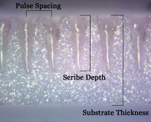 使用多合一配置允许客户在完成构建和处理组件后将基板按尺寸对齐,当以多层配置划线陶瓷基板时,重要的是在更大程度上控制划线参数。虽然清洁和成功“捕捉”的平均划线深度仍在基板厚度的 30% 至 50% 范围内,但确保脉冲间距与材料厚度正确对齐变得更加重要。如果脉冲间隔太紧或脉冲深度太深,则基板可能会随着基板材料的后续处理而过早破裂。