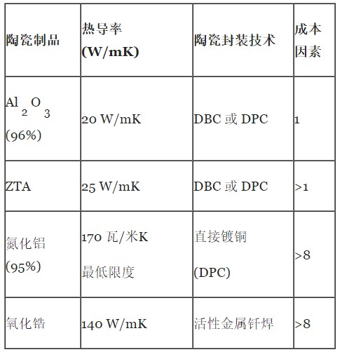 陶瓷封装材料的性能从使用96%氧化铝作为相对成本基础的图1中可以清楚地看出,更高的热性能伴随着材料成本的大幅增加。我们将描述一种基于氮化铝陶瓷基板的解决方案,从成本和热性能的角度来看,该解决方案将提供介于96%氧化铝和传统氮化铝之间的解决方案。