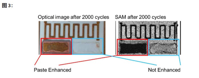 图 3描绘了在 2000 次热冲击循环后具有浆料增强的 Cu 结构和未增强的 Cu 结构的基板的光学图像和 SAM 测量值。即使经过 2000 次循环,增强部分实际上也没有变化。
