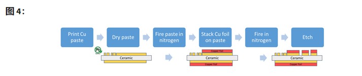 > 铜浆丝网印刷在陶瓷的两面,可以包括可以用作逻辑电路的精细结构;