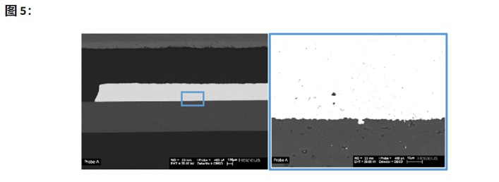 我们通过SEM分析了陶瓷与铜浆之间以及铜浆与铜箔之间的界面图5,由于材料的致密烧结,无法识别浆料和箔之间的界面。陶瓷和铜之间的界面是无空隙的。这对于基板的可靠性和局部放电特性非常重要。在铜层内可以看到一些小的空隙,可以忽略不计,对放电性能没有影响。