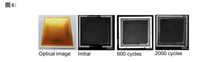 总铜厚度约为 350 μm 和氧化铝厚度为 630 μm 的2″×2″ PBC 基板经受与相同的热冲击循环。图6左侧描绘了2000 次热冲击循环后基板的光学图像。最初和 600 和 2000 次循环后,衬底的特征是SAM。最初可以看出,铜箔的边缘没有完美地结合到厚膜层上。这是由于当时没有优化处理。600和2000 次热冲击循环后的SAM图像表明,没有发生额外的分层。