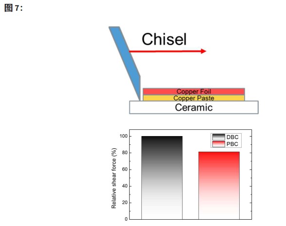PBC 技术的附着力在 4×4 mm 2 Cu箔上进行测试。使用剪切测试仪,测量凿子剥离铜的最大力(图7顶部)。与 DBC 相比,PBC 的最大作用力如图 7所示。DBC 80% 以上的剪切力是由 PBC 实现的。