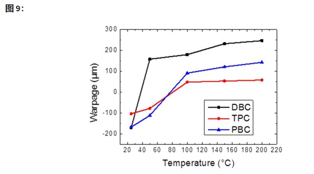 【DBC、TPC 和 PBC 基板在室温和 200 °C 之间的翘曲。TPC 的翘曲变化最小,DBC 最高,PBC 居中。】