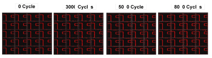 20个单独的测试布局在热冲击测试之前和之后的SAM图片(液体到液体-65℃到+150℃)。8000次循环后没有明显的退化,红色表示蚀刻的隔离槽,它是测试布局的一部分。如果铜和钎焊金属之间因热冲击而分层,红色凹槽会变宽,这表明含银AMB技术类似的方式充分利用Si3N4陶瓷的机械强度。
