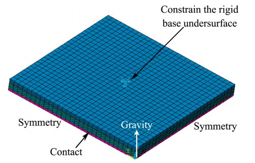 模型采用3D弹塑性有限元分析方法。使用8节点对模型进行网格划分,在模拟中过程中,对模型施加的约束如图2所示。将样品和刚性底座设置为接触对,使样品可以自由弯曲。采用1/4对称模型来简化有限元计算。