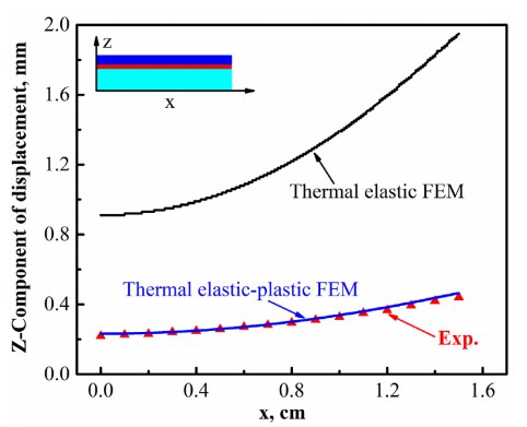 本文对热弹性有限元的计算结果将热弹塑性有限元法与热弹塑性有限元法进行比较,热弹塑性有限元法计算的结果更接近实际测量结果。在这个模型中,陶瓷的厚度是0.635毫米,铜金属层的厚度为0.3毫米,厚度为Ag-Cu-Ti 焊料层为 50 μm。样品的变形为用数显高度计测量,如图3所示。如果塑料不考虑焊接过程的变形,可靠性计算量会大大减少。但是,计算结果热弹塑性有限元模型更适合实际