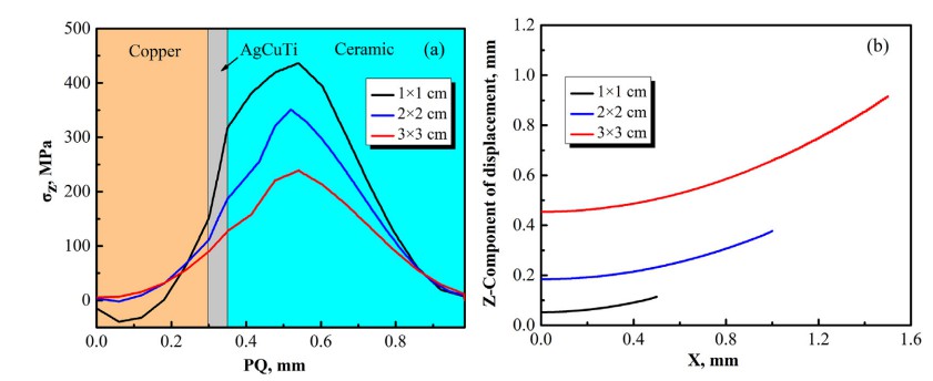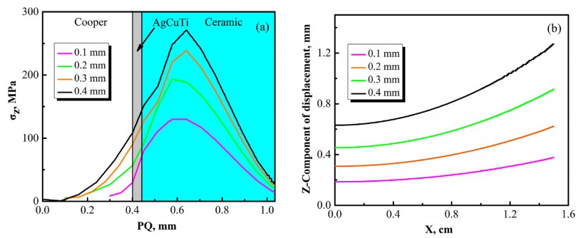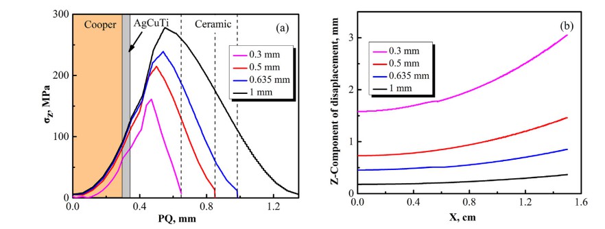 不仅影响轴向残余应力和翘曲变形,由材料的热膨胀系数和尺寸决定的基板。不同陶瓷厚度的有限元模型模拟揭示了陶瓷厚度对翘曲变形和残余应力的有影响。铜膜厚度为0.3mm,Ag-Cu-Ti填充金属层为50μm,面积为陶瓷基板保持不变。轴向残余应力和陶瓷基板的翘曲变形图,厚度为0.635mm如图5a和图5b所示。从轴向残差应力图,最大轴向应力集中在陶瓷上边。可不同陶瓷沿PQ路径的σz分布厚度如图6a所示。可以看出来,陶瓷厚度变化对最大σz有很大影响。