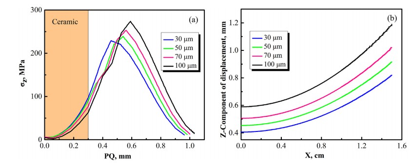 当陶瓷厚度增加,残余应力分布保持不变基本不变,但峰值应力增加。很明显陶瓷厚度越大,轴向应力越大。此外,可以看出轴向应力是拉伸的,如图6b所示陶瓷厚度与z分量的关系。沿MN路径的位移,需要注意X定义为长度从M到N,表明随着陶瓷厚度的增加,整体翘曲逐渐减小。从图6(a)和图6(b)可以看出,对应陶瓷厚度的最大轴向残余应力0.3mm、0.5mm、0.635mm和1mm分别为161 MPa、215 MPa、239 MPa和278兆帕。分别对应陶瓷厚度0.3 mm、0.5 mm、0.635 mm和1 mm的最大轴向位移分别为3.165毫米、1.47毫米、0.922毫米和0.376毫米。什么时候陶瓷厚度为0.3 mm,变形最大,相应陶瓷基板的轴向应力最小。