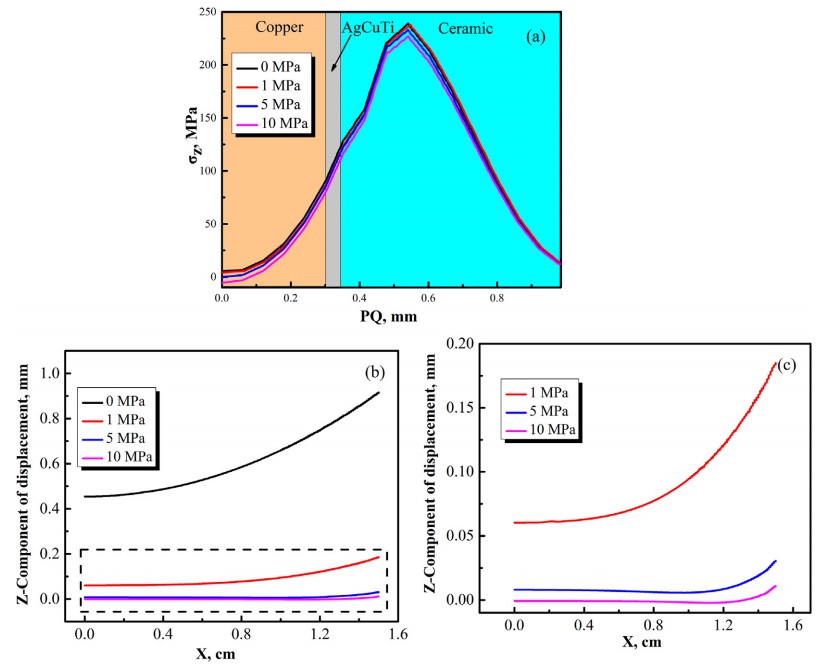 热应力的产生是一个积累的过程,界面的轴向残余应力和翘曲变形可通过在AMB陶瓷基板上施加一定的压力来减少钎焊过程中,结果如图9所示。随着钎焊压力,轴向残余应力的分布趋势为基本不变,但施加的压力越大,释放界面的轴向残余应力。当压力为1 MPa时,界面处的应力与未施加压力时相同。然而,在 10 MPa 基底压力下,轴向残余应力降低到227 MPa。同时,压力不宜过大,否则会导致陶瓷破裂和焊料溢出。图10(a)显示了沿 PQ 路径的 σz 分布,适用于不同的压力基板。图10(b)显示了Z分量沿MN路径和图10(c)显示了放大的区域。