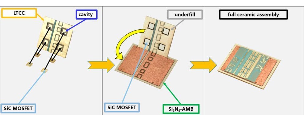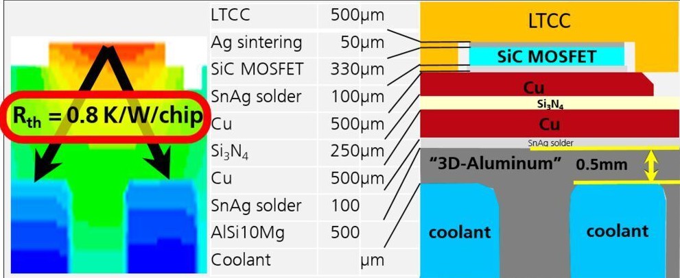 从SiC MOSFET结到冷却剂的总热阻测得为0.8K/W每芯片,这种陶瓷基板组件能够在比150℃高的温度下工作,例如在电机逆变器中也可以在LTCC中建立散热通孔,以实现双面冷却。