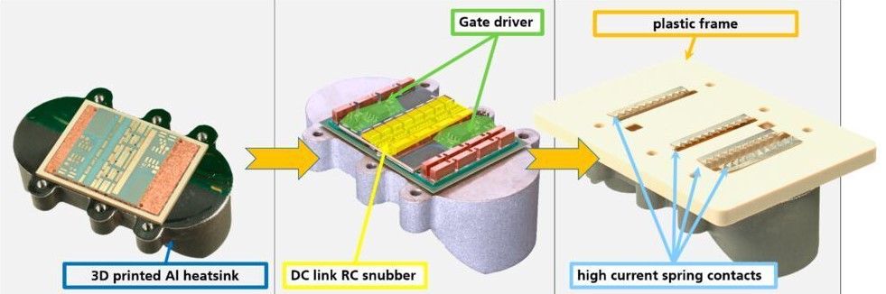超低直流回路电感,由于直流回路RC缓冲器直接放置在电源模块上,低电感系统集成可实现快速且无振荡的电源模块切换。低栅极阻抗确保无寄生开启和低开启损耗,基于LTCC的电源模块提供的功率足以为150kw电机逆变器供电。该功率模块在高速开关方面树立了标准,并结合了低热阻和高工作温度。