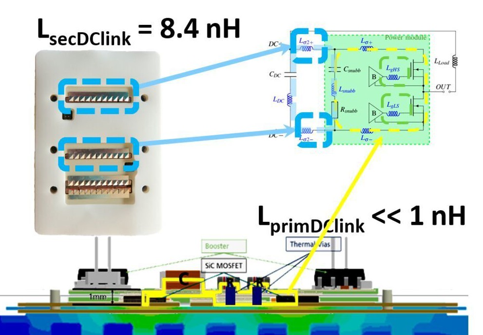 低电感大电流连接器采用0.3mm扁平多触点弹簧连接器,这些降低了PCB上200F次级直流链路箔电容器与电源模块顶部RC缓冲器之间连接的杂散电感。这些连接的低电感对于快速开关性能至关重要,因此我们只有8.4nH的次级直流链路电感如图4所示中的蓝色环路所示。