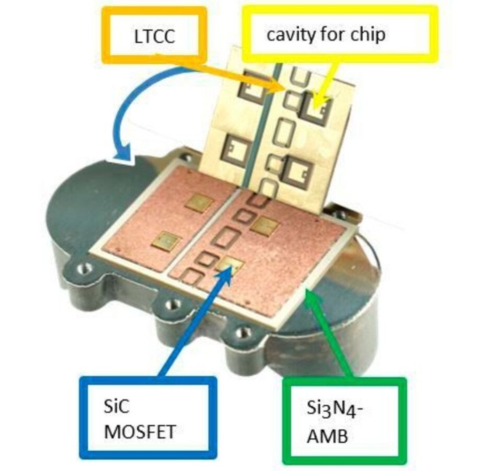 然后,通过将带有芯片的LTCC烧结或焊接到Si3N4-AMB陶瓷基板上,可以实现具有良好热性能的芯片背面接触如图1.3所示。与其它陶瓷基板相比,碳化硅陶瓷基板提供了最佳的机械稳健性以及出色的导热性,是需要高可靠性和高功率密度应用的合理选择。所得陶瓷组件内的材料在热膨胀系数(CTE)方面非常匹配。因此,期望在高工作温度下具有高可靠性。