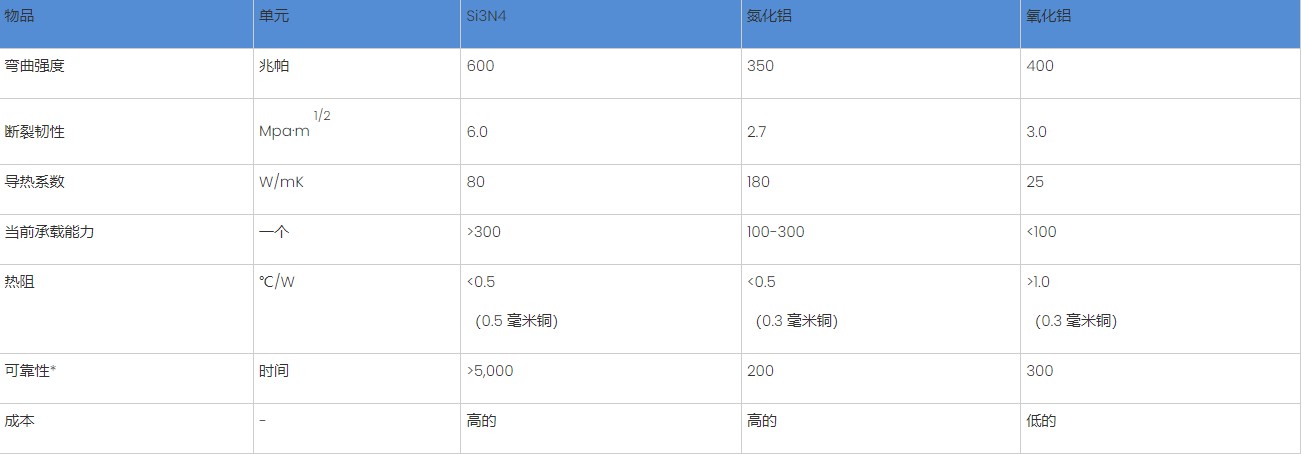 目前应用最广泛的陶瓷基板材料主要是AI2O3氧化铝和AIN氮化铝。氮化硅与其性能相比如何?下表是三种陶瓷基板的基本性能对比。可以看出,氮化硅陶瓷基板材料具有明显的优势,尤其是氮化硅陶瓷材料在高温条件下的耐高温性能、对金属的化学惰性,以及超高的硬度和断裂韧性等机械性能。