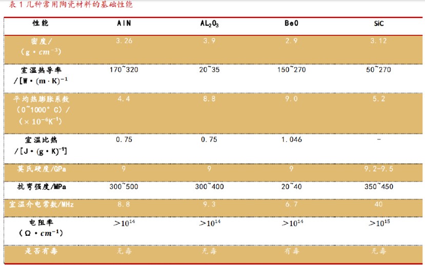AlN 相较其他陶瓷材料,与硅相匹配的热膨胀系数,加上优秀的热导性,更有利于应用于电子产业。根据《AlN 陶瓷热导率及抗弯强度影响因素研究的新进展》的研 究中提到,AlN 因其热膨胀系数与 Si 匹配度高而被广泛关注,而传统的基板材料如 Al2O3 由于其热导率低,其值约为 AlN 陶瓷的 1/5 且线膨胀系数与 Si 不匹配,已经不 能够满足实际需求。BeO 与 SiC 陶瓷基板的热导率也相对较高,但 BeO 毒性高,SiC 绝缘性不好。而AlN 作为一种新型高导热陶瓷材料,具有热膨胀系数与 Si 接近、散热性能优良、无毒等特性,有望成为替代电子工业用陶瓷基板 Al2O3、SiC 和 BeO 的极佳材料。