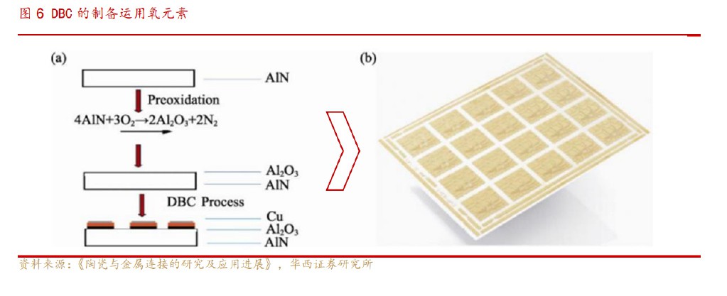 由于 IGBT 输出功率高,发热量大,散热不良将损坏 IGBT 芯片,因此对 IGBT 封装而言,散热是关键,必须选用陶瓷基板强化散热。氮化铝、氮化硅陶瓷基板具有热导率高、与硅匹配的热膨胀系数、高电绝缘等优点,非常适用于IGBT以及功率模块的封装。广泛应用于轨道交通、航天航空、电动汽车、智能电网、太阳能发电、变频家电、UPS等领域。根据《电子封装陶瓷基板》的研究显示,目前 IGBT 封装主要采用 DBC 陶瓷基板。主要因为DBC基板金属线路层较厚 (一般为100μm ~ 600μm),具有载流能力大、耐高温性好及可靠性高等特点。