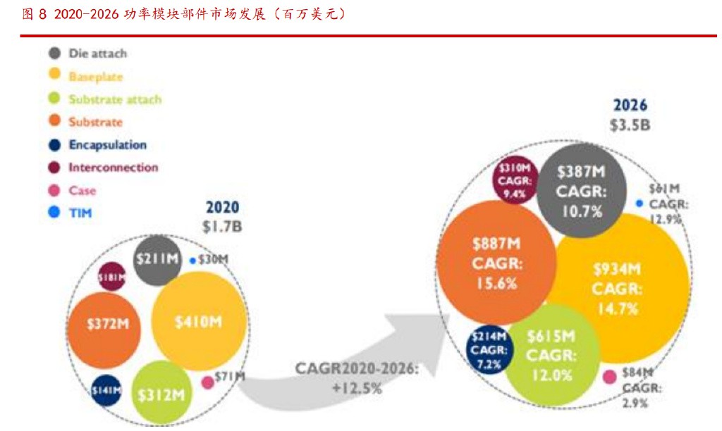 而随着光伏、风电蓬勃发展,新能源汽车渗透率提高,功率模块带动 AlN 陶瓷 基板需求增长。IGBT 功率器件是光伏、风力发电时电能转换与电路控制的核心,同时也在新能源汽车的电动机等核心部件中起着关键作用,随着光伏、风电占比的不断提高,功率器件以及封装所用陶瓷基板的需求将迎来大规模增长。在传统的 IGBT模块中,氧化铝陶瓷基板是最常用的陶瓷基板,但氧化铝陶瓷基片相对低的热导率、与 硅的热膨胀系数匹配不好,随着新能源汽车向着高压化、高功率化发展,氧化铝已不再适合作为封装材料。近年来,AlN、Si3N4 陶瓷基板以其耐高温和热稳定性好、介电常数和介质损耗低、耐磨损、耐腐蚀等优异的性能,在 IGBT 模块封装中得到青睐, 逐步替代 Al2O3 陶瓷基板。此外,新能源汽车用 IGBT 模块的功率导电端子需要承载数 百安培的大电流,对电导率和热导率有较高的要求,车载环境中还要承受一定的振动和冲击力,机械强度要求高,因此Si3N4凭借其硬度高、机械性能好的特性在新能源 车用 IGBT 模块中得到了更广泛的应用。随着光风储能与新能源汽车行业的快速发展带动功率模块需求激增,氮化铝与氮化硅陶瓷基板的市场也随之扩大。