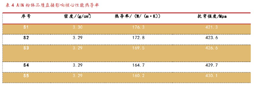 高性能的氮化铝关键在于粉体制备。高质量粉末原料是获得高性能氮化铝制品的先决条件,要制备高性能的氮化铝制品,首先需要制备出高纯度、细粒度、分散性好和烧结性优的氮化铝粉末。如何提高氮化铝转化率,降低粉末杂质含量以及反应能耗,缩短工艺流程,节约成本是制粉过程中最关心的问题。因此,为了制备高相对密度、高导热和高强度的氮化铝陶瓷,如何制备优质的氮化铝粉末得到了国内外研究者们的密切关注。高品质粉体对下游生产影响大,我们认为上下游一体粉体兼有的企业优势更大。根据《高性能AlN粉体合成、特性及成瓷验证》中提到,高品质AlN粉体是制备高性能AlN陶瓷基板的重要的前提与保障。不同品质的AlN粉体制备的AlN陶瓷基板的密度数值稳定,均保持在3.29-3.30 g/cm3,但其热导率和抗弯强度的数值变化幅度较大。