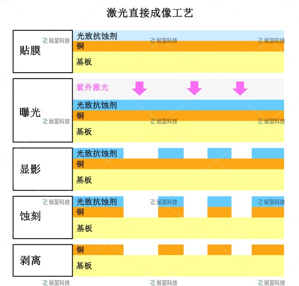 在电路板 (PCB) 制造中,成像过程定义了铜电路图案。传统的成像工艺采用光刻机和紫外光来传输电路图像,而 LDI 仅使用计算机控制的高度聚焦激光束,直接在覆盖有激光光刻胶的 PCB CCL铜层上定义电路图案。